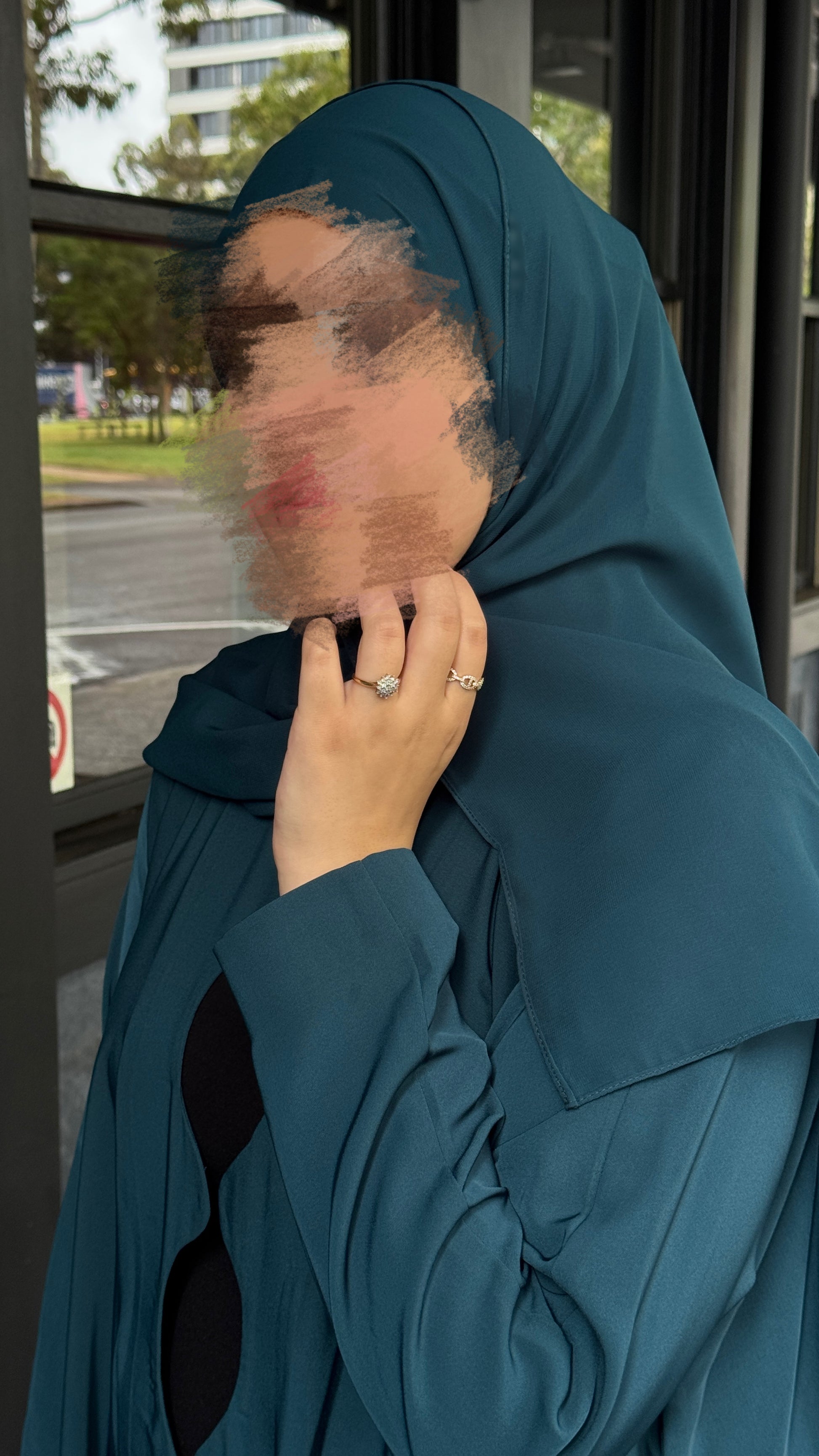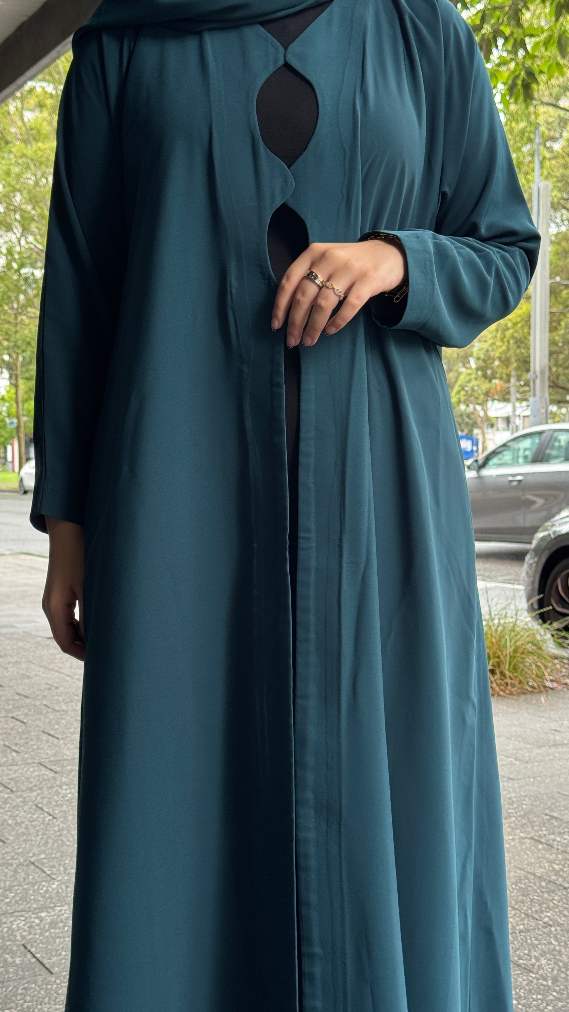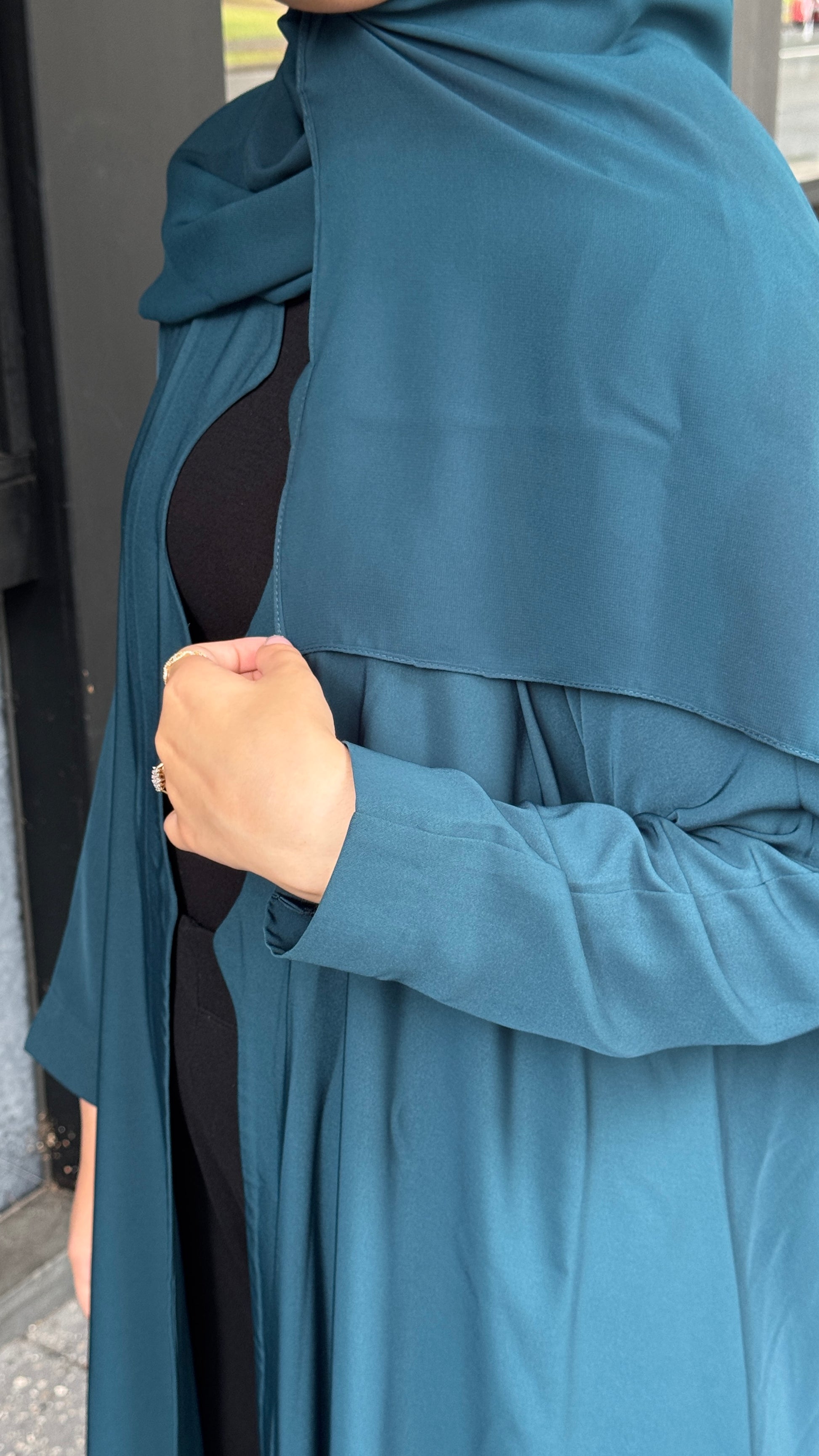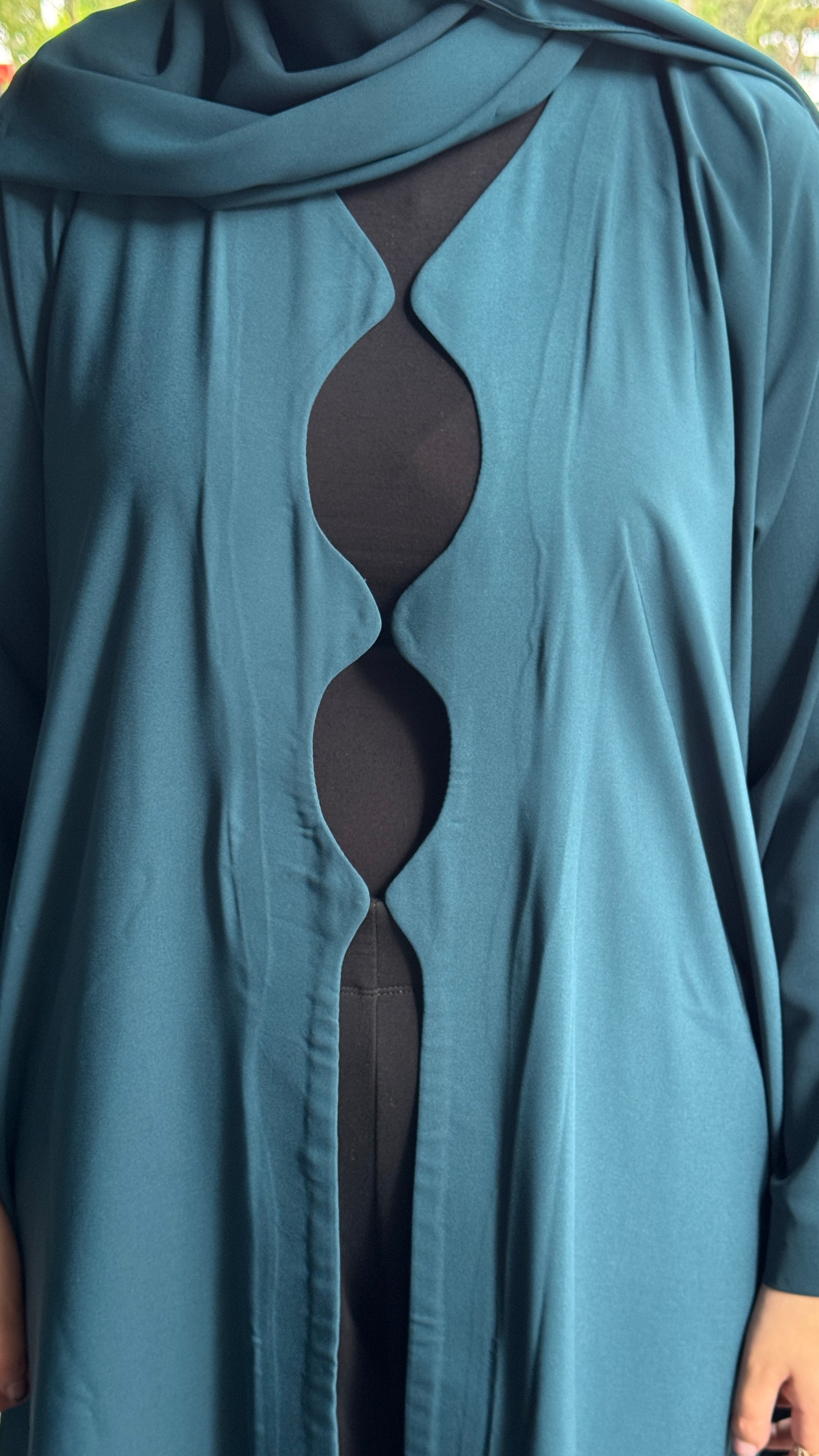 Fluid lines and a wave inspired front cut evoke movement and tranquillity. Crafted in a rich dark cyan, this serene, sophisticated abaya flows gracefully with every step. Complete with a matching scarf, Whispering Waves is designed for those who move through life with effortless elegance and poise.